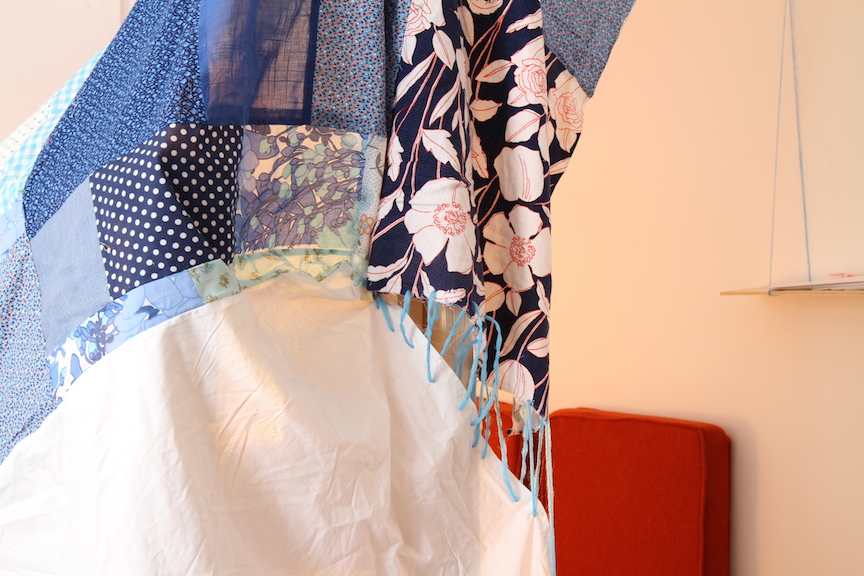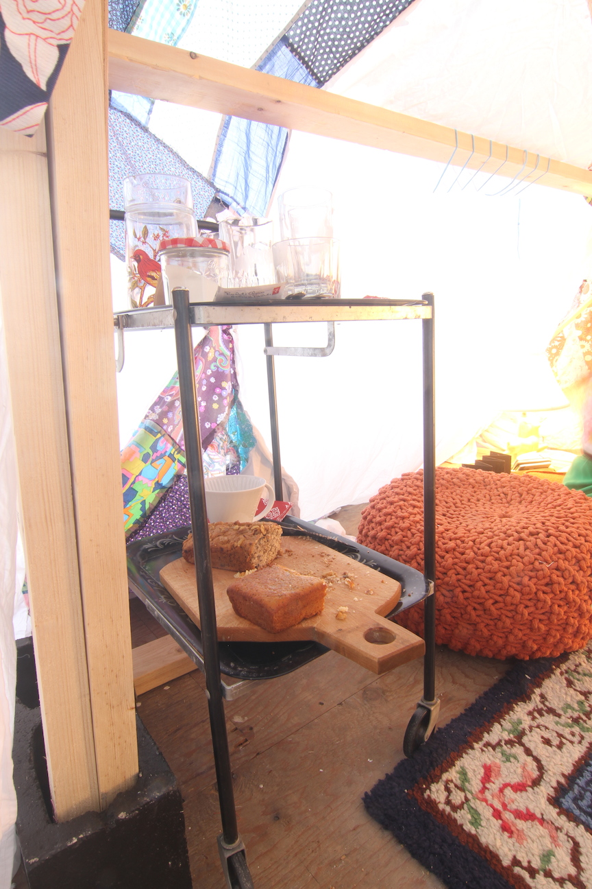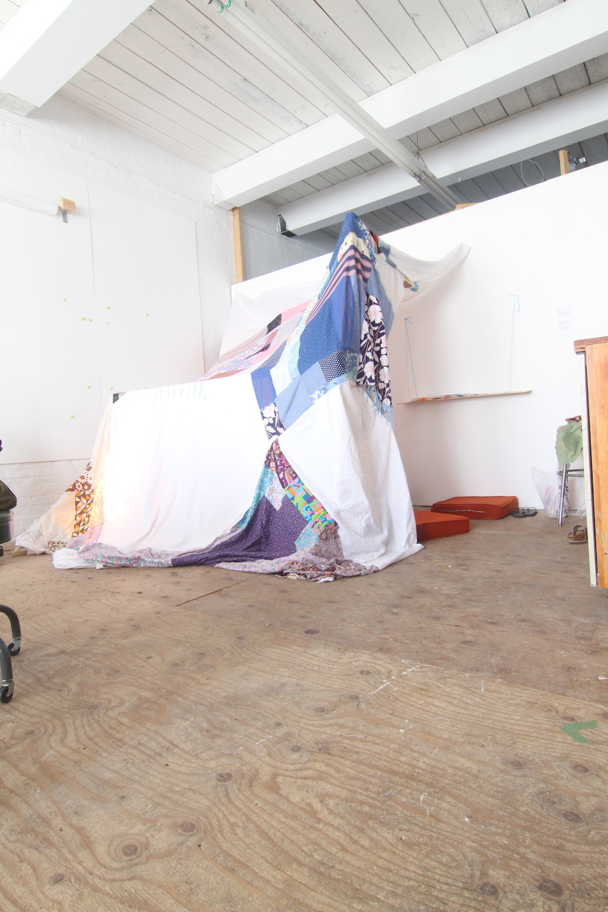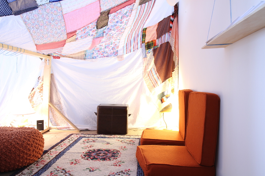 1/7 sites of exhibition. Hosted by me. Materials: quilts, cushions, lamp, chairs, food, people, small books: Knitting Lessons, A Lament: why my art is failing, winter: her first year, Future Projects, ________ of action.