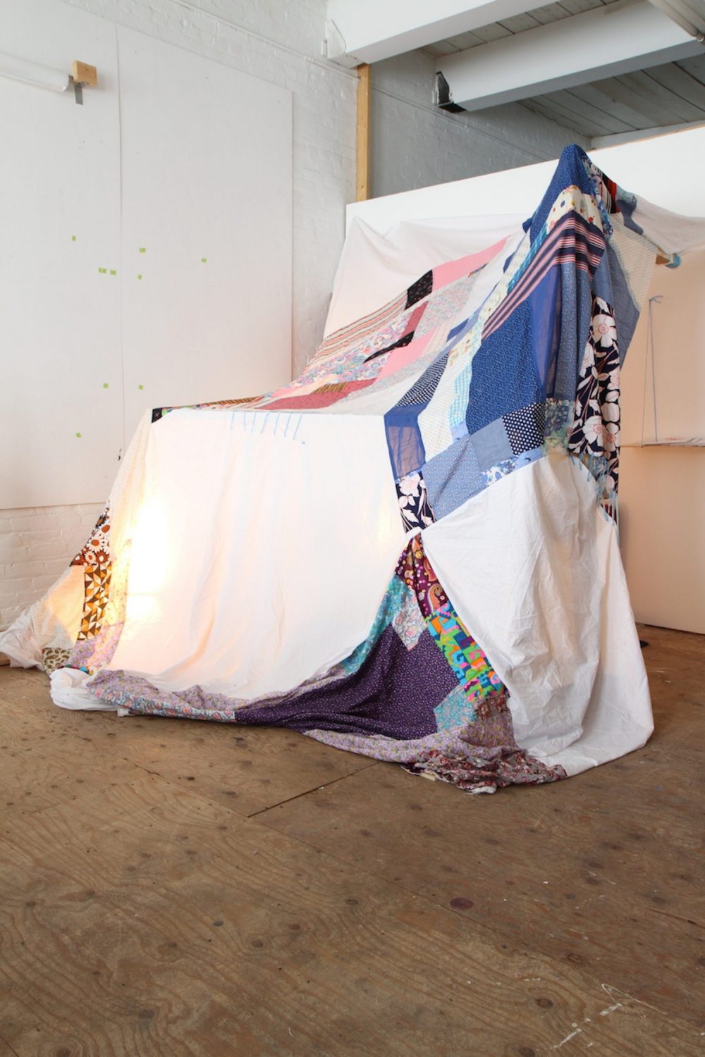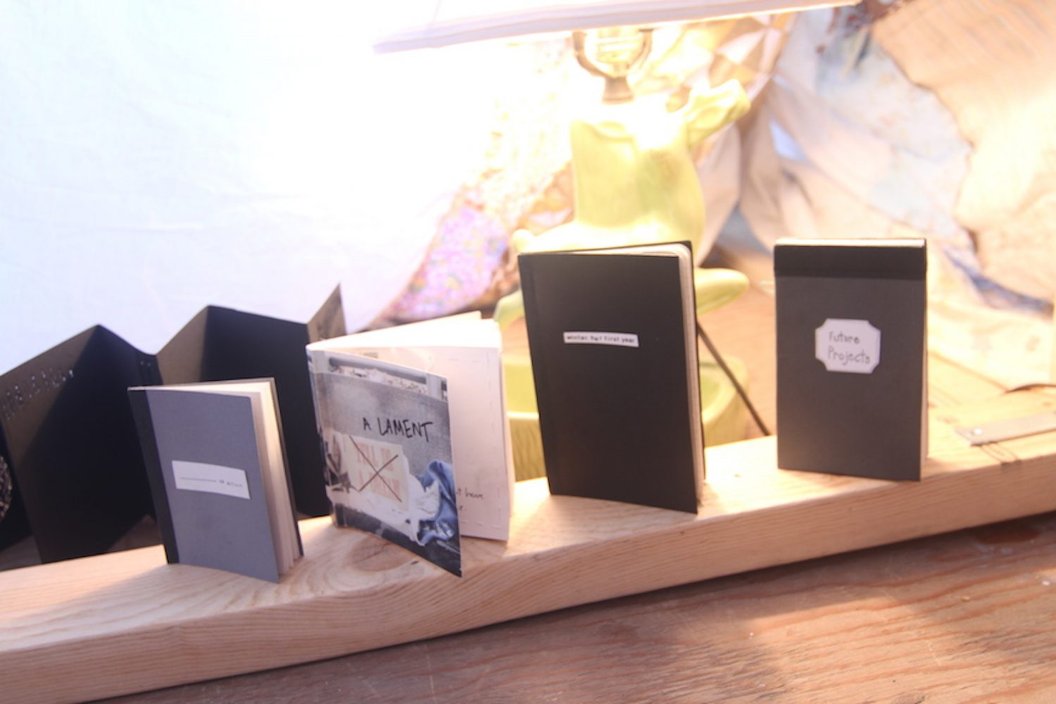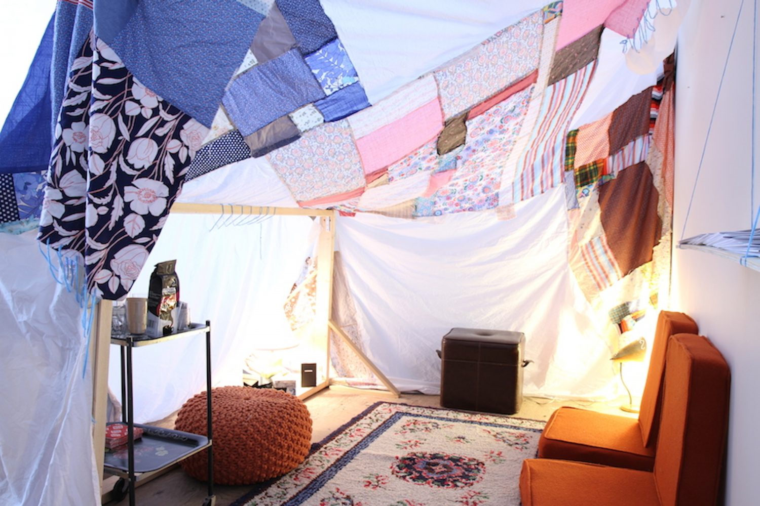 1/7 sites of exhibition. Hosted by me. Materials: quilts, cushions, lamp, chairs, food, people, small books: Knitting Lessons, A Lament: why my art is failing, winter: her first year, Future Projects, ________ of action.